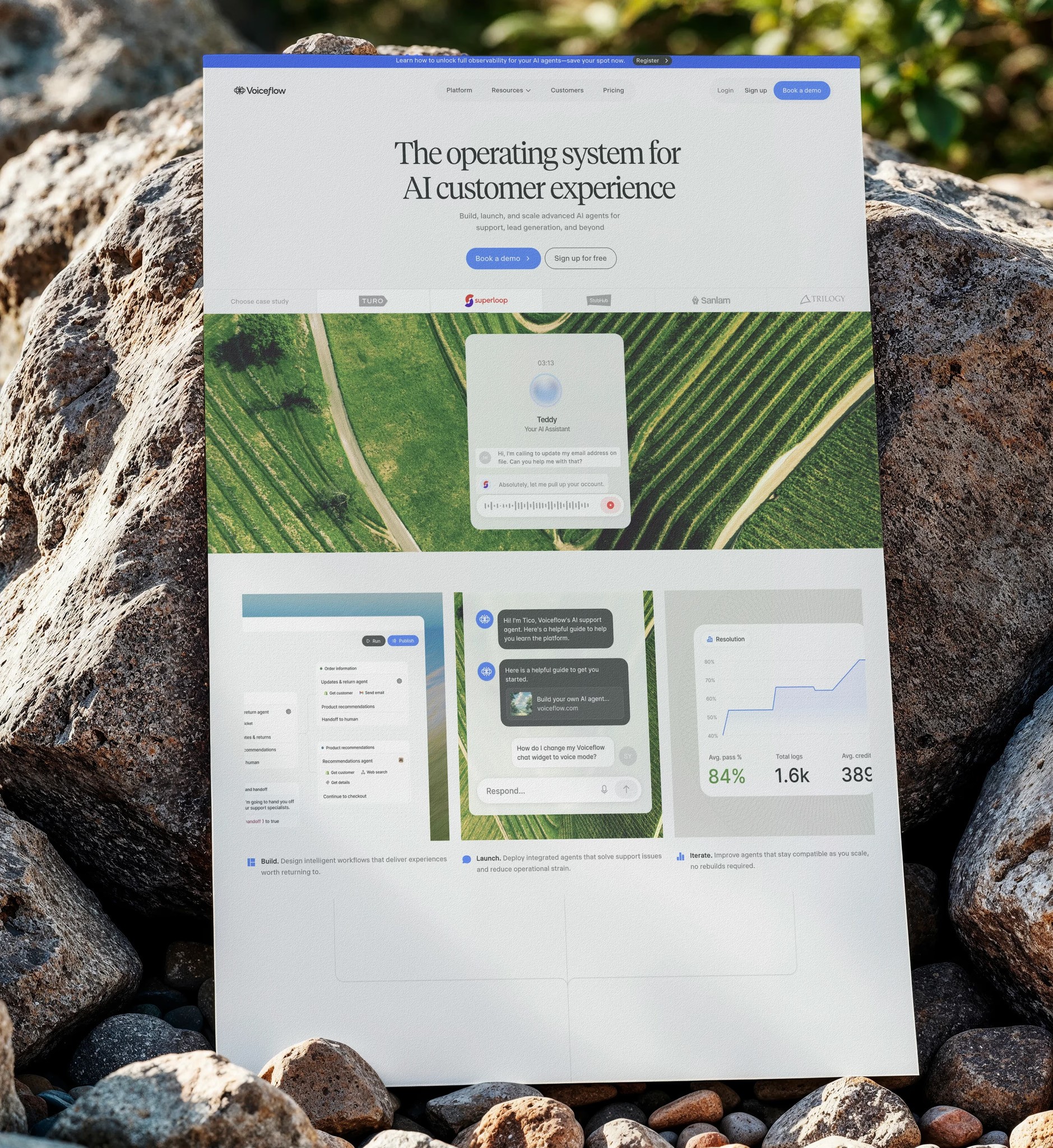 We became Voiceflow's embedded web team — shipping a full Webflow reskin, AI demo builds, and continuous design work alongside their product org.